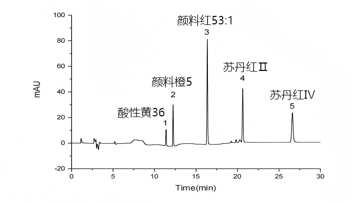 UV416nm(酸性黃 36), UV484nm(顏料橙 5、顏料紅53:1、蘇丹紅Ⅱ), UV514nm(蘇丹紅Ⅳ)
