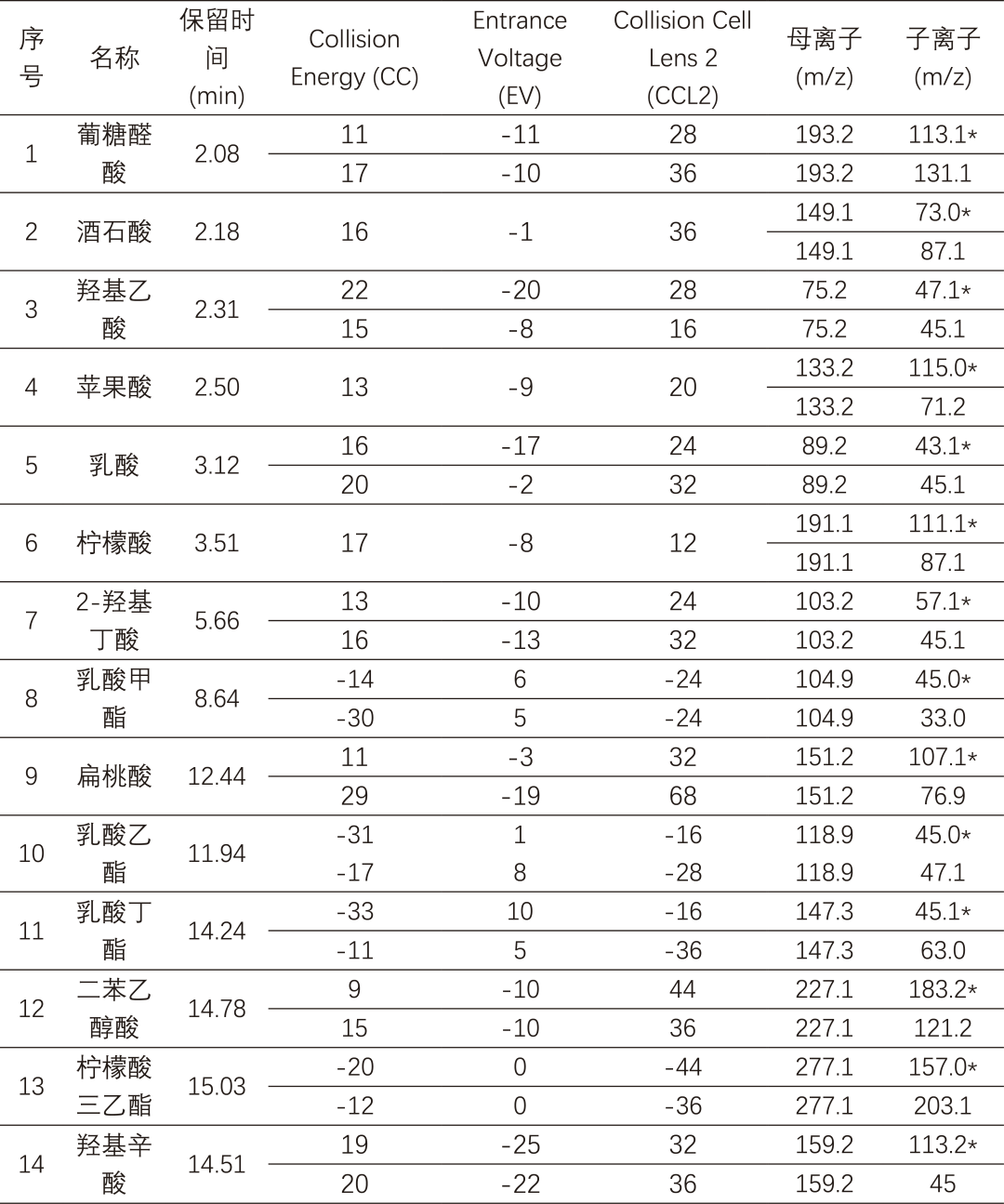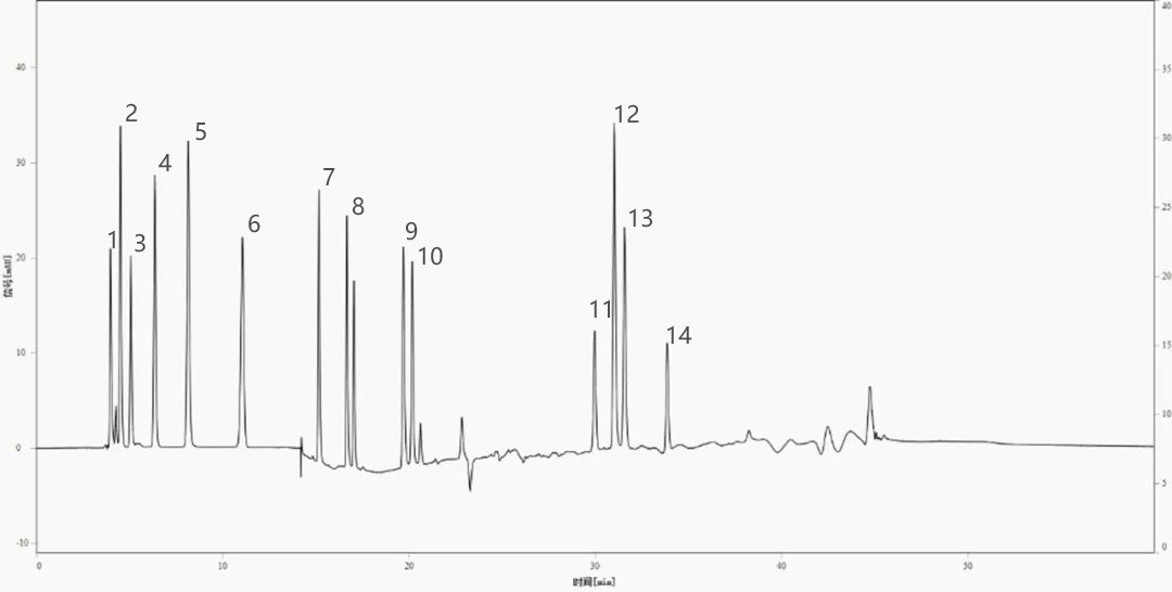 14種混標色譜圖1.葡糖醛酸 2.酒石酸 3.羥基乙酸 4.蘋果酸 5.乳酸 6.檸檬酸 7.2-羥基丁酸 8.乳酸甲酯 9.扁桃酸10.乳酸乙酯 11.乳酸丁酯 12.二苯乙醇酸 13.檸檬酸三乙酯 14.羥基辛酸
