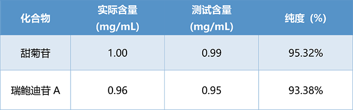 2、分離純化效能: 選擇甜菊糖苷中高價值組分——甜菊苷和瑞鮑迪苷A作為測試樣品,設備自動進樣10mL樣品,利用其時間+閾值方法精準收集目標餾分。如下表所示,純度均高于93%,相比文獻報道的傳統三步樹脂法(~92.9%)更具優勢。證明了設備在快速分離、穩定輸出、精準收集上的性能,顯著提升產品純度和效率。