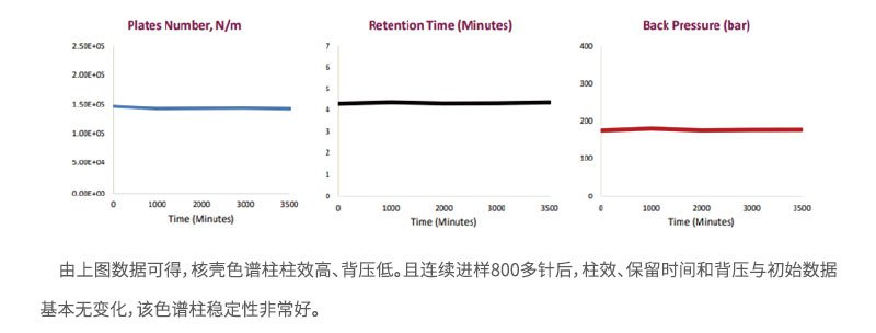 在相同的色譜條件下,核殼色譜柱可以超過大多數亞2μm多孔型色譜柱的柱效,且柱壓只有亞2μm多孔型色譜柱的一半。由于實心核的存在,樣品分子傳質路徑短,極大的提高了分析速度??梢詫崿F在常規HPLC上,獲得超高的柱效和更快的分離。
