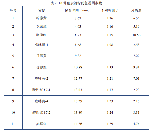 方法驗證數據:10 種色素的線性范圍(R2≥0.999)、精密度(RSD<2%)、加標回收率(85%-110%)完整記錄;