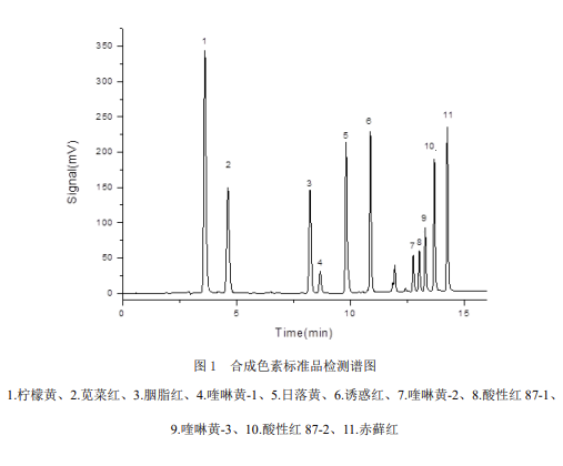 將樣品提取液和合成著色劑標準使用液分別注入高效液相色譜儀,根據保留時間定性,外標峰面積法定量。