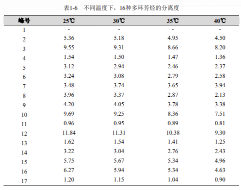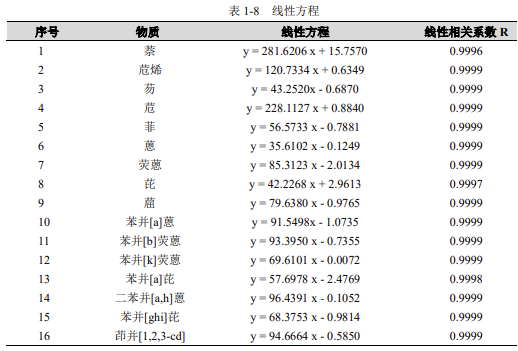 將 16 種多環芳烴標準工作液,按 1.3.2 中色譜條件進行分析,16 種多環芳烴線性如下表所示: