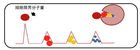 在樣品分離過(guò)程中,大于尺寸排阻極限的化合物將會(huì)不受阻礙,直接通過(guò)柱子;而在工作范圍內(nèi)的小的化合物將會(huì)被填料截留,隨著溶劑的洗脫逐漸滲透過(guò)填料的孔,隨后流出柱子,從而達(dá)到樣品分離的目的。