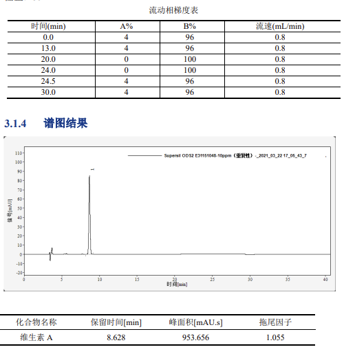 維生素 A 標準儲備溶液(0.500mg/mL):準確稱取 25.0mg 維生素 A 標準品,用無水乙醇溶解后,轉移入 50mL 容量瓶中,定容至刻度,此溶液濃度約為 0.500mg/mL。將溶液轉移至棕色試劑瓶中,密封后在 - 20℃下避光保存,有效期 1 個月。