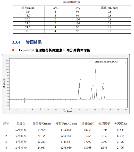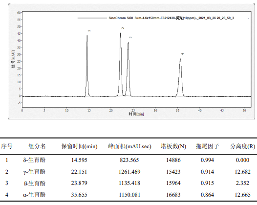 維生素 E 標準儲備溶液(1.000mg/mL):分別準確稱取 α- 生育酚、β- 生育酚、γ- 生育酚和 δ- 生育酚各 50.0mg,用無水乙醇溶解后,轉移入 50mL 容量瓶中,定容至刻度,此溶液濃度約為 1.00mg/mL。將溶液轉移至棕色試劑瓶中,密封后在 - 20℃下避光保存,有效期 6 個月。
