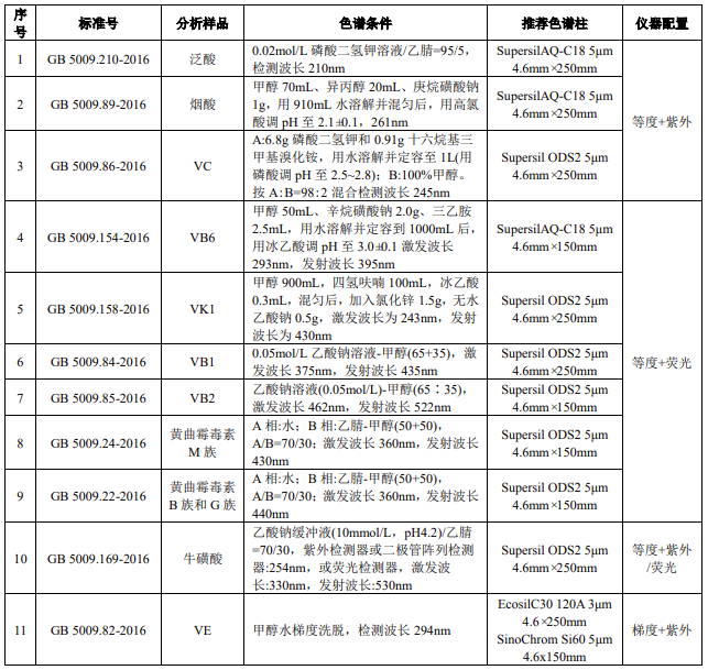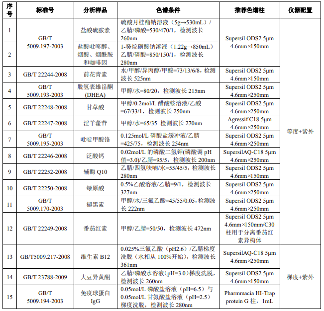 4.1 保健品中常見分析物質的色譜柱推薦及儀器配置 ......................... 14