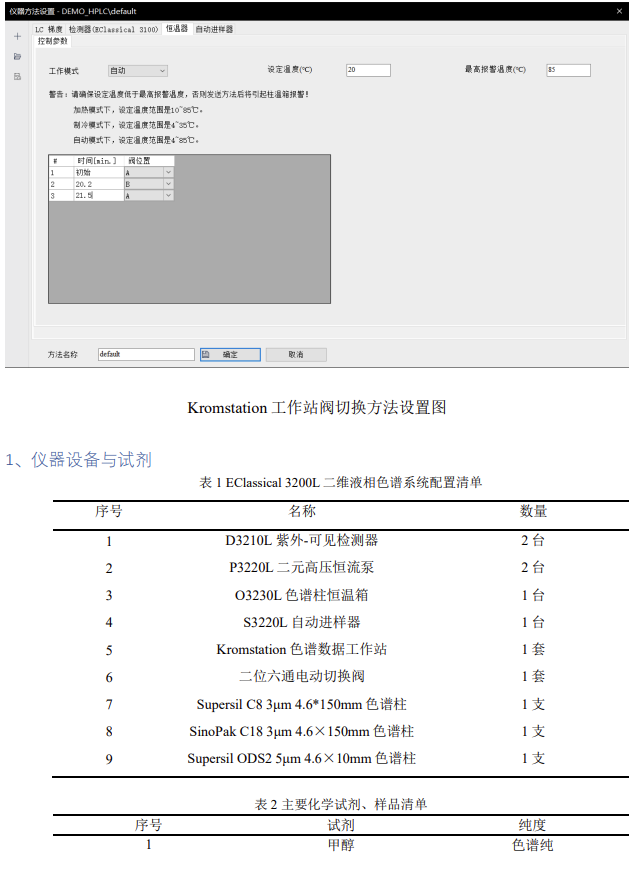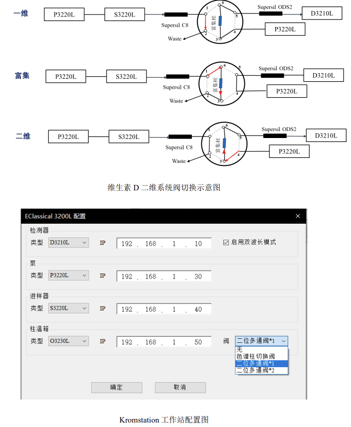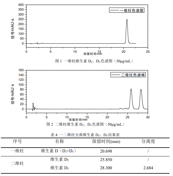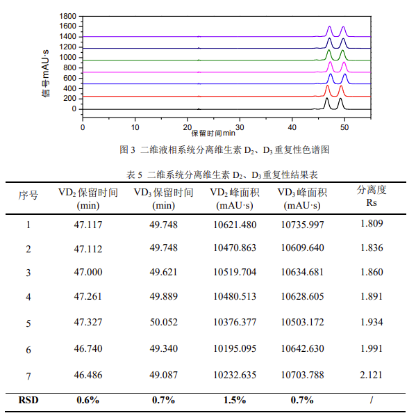 根據以上實驗數據,Kromstation 色譜數據工作站可以實現對 EClassical 3200L 二維系統的全反控。根據 GB 5009.296-2023《食品安全國家標準 食品中維生素 D 的測定》第二法:在線柱切換 - 反相液相色譜法(二維液相色譜法)分離維生素D_2、D_3,Kromstation 色譜數據工作站可以自動實現二維系統的閥切換完成維生素D_2、D_3的分離,且實驗結果具有良好的重復性和分離度,滿足對維生素 D 同分異構體的分離檢測需求。