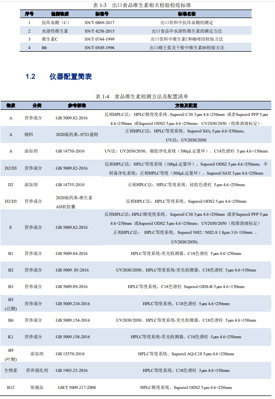 維生素是食品中重要的營養成分,缺乏維生素會導致嚴重的健康問題,適量攝取維生素可以保持身體健康,過量攝取維生素卻會導致中毒;因此食品中維生素含量的檢測至關重要。國家頒布多項標準法規,對食品、保健品、食品添加劑等中維生素含量檢測進行規范,以保障食品安全。依利特儀器參考國家標準及文獻,整理了食品中維生素檢測解決方案,供相關企業參考使用。