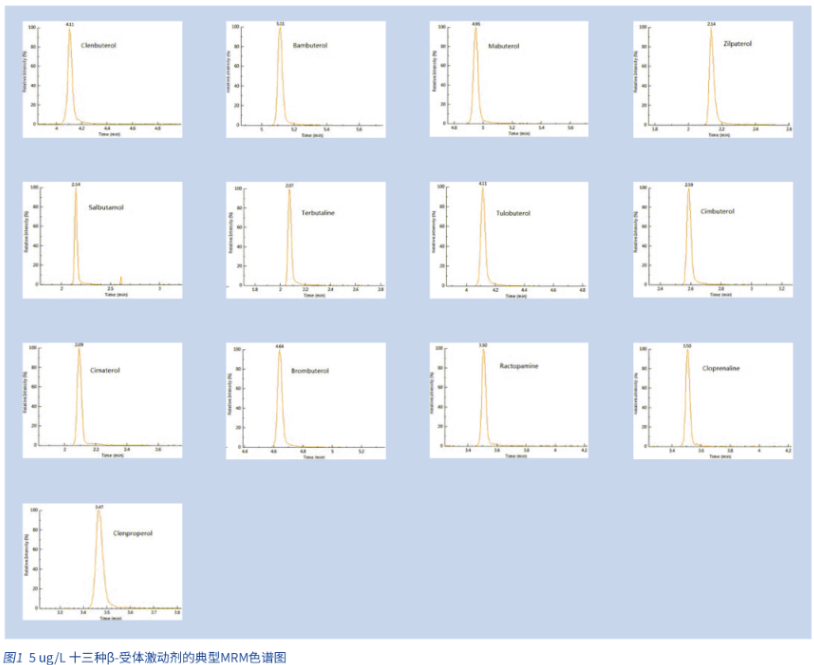 在上述實驗條件下得到的十三種 β- 受體激動劑的典型 MRM 色譜圖見圖 1。十三種 β- 受體激動劑的藥物可以實現色譜分離且峰形良好,經過優化的梯度可以和基質干擾分開。