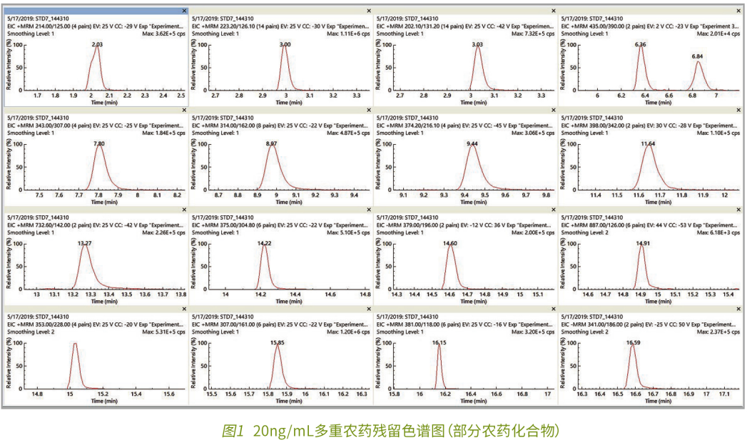 在上述實(shí)驗(yàn)條件下得到數(shù)種農(nóng)藥化合物的 MRM 色譜圖,見(jiàn)圖 1。