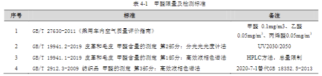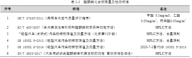 以下標準分別對汽車尾氣、內飾、車內空氣限量標準 / 檢測方法進行了規范,以盡量減少醛酮化合物的污染: