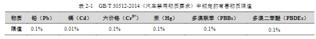 隨著經濟的發展,人們對汽車的安全性、舒適性要求逐漸提高,對汽車生產中使用的有毒有害物質限量要求也越來越嚴格。多溴聯苯和多溴二苯醚作為常用的阻燃劑,在汽車車體和內飾中廣泛存在。GB/T 30512-2014 《汽車禁用物質要求》對汽車零部件的禁用有害物質的含量限值進行了要求,詳見下表: