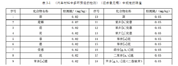 汽車內有多種物質可能向車內釋放多環芳烴,如汽車的配件 (坐墊、座椅套)、車內飾 (門內護板) 以及生產車時使用的油漆、稀釋劑、粘合用的膠水,甚至一些劣質的香水、空氣凈化劑等,都可能含有多環芳烴。全國汽車標準委員會 2019 年 5 月 13 日公布了《汽車材料中多環芳烴的檢測》(征求意見稿),該標準是新制定的行業標準,將作為 GB30512《汽車禁用物質要求》的修訂版配合標準實施,預計 2020 年開始執行。