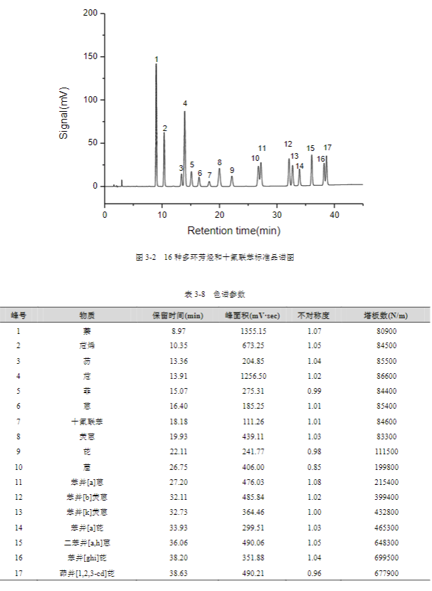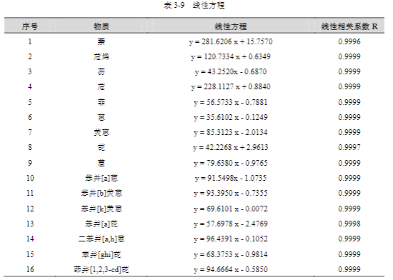 將 16 種多環芳烴標準工作溶液,按 3.3 中色譜條件進行分析,16 種多環芳烴線性如下表所示。