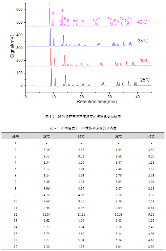 進樣分析濃度為 5μg/mL 的 16 種多環芳烴和 2μg/mL 十氟聯苯工作液,使用 3.3 中的色譜條件,實驗溫度分別為 25℃、30℃、35℃、40℃,結果如下圖所示: