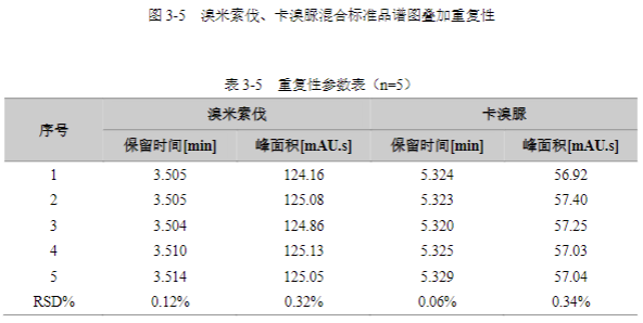 濃度為50 mg/L卡立普多 標準溶液,連續進樣 5針,峰面積和保留時間 RSD結果如下: