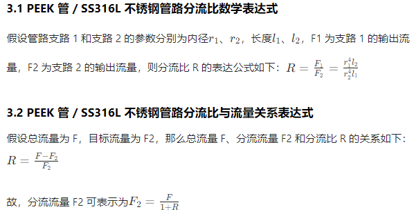 通過 PEEK 管 / SS316L 不銹鋼管路分流比數學表達式計算,可選取內徑為 0.04”I.D.、長為 256mm 的 PEEK 管作為支路 1;內徑為 0.01”I.D.、長為 999mm 的 PEEK 管作為支路 2,則支路 2 的流量即為 1μL/min。