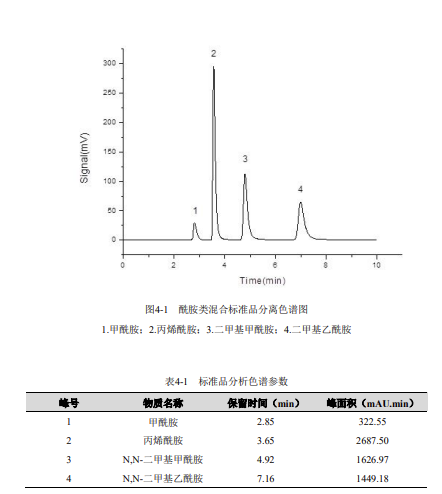 準(zhǔn)確稱(chēng)取 0.100g (精確至 ±0.0001g) 甲酰胺、0.100g (精確至 ±0.0001g) N,N - 二甲基甲酰胺、0.100g (精確至 ±0.0001g) N,N - 二甲基乙酰胺和 0.100g (精確至 ±0.0001g) 丙烯酰胺,用水溶解后全量轉(zhuǎn)入 100mL 容量瓶中,用水稀釋定容至標(biāo)線,搖勻。配制成甲酰胺、N,N - 二甲基甲酰胺、N,N - 二甲基乙酰胺和丙烯酰胺濃度分別為 1000mg/L、500mg/L、1000mg/L 和 500mg/L 的酰胺類(lèi)化合物混合標(biāo)準(zhǔn)貯備液,于 4℃以下冷藏、避光和密封可保存三個(gè)月,使用時(shí)應(yīng)恢復(fù)至室溫并搖勻。