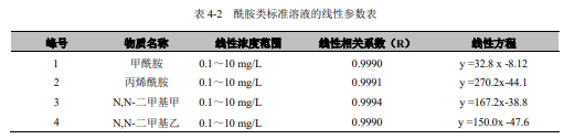 分別移取 0.10mL、2.50mL、5.00mL、8.00mL、10.00mL 酰胺類(lèi)化合物標(biāo)準(zhǔn)使用液置于一組 50mL 容量瓶中,用水定容至標(biāo)線,搖勻。由低濃度到高濃度依次移取 5.0μL 注入液相色譜儀,按照液相色譜參考條件進(jìn)行分析測(cè)定。以標(biāo)準(zhǔn)系列溶液中目標(biāo)化合物的濃度 (mg/L) 為橫坐標(biāo),以峰高或峰面積為縱坐標(biāo),建立酰胺類(lèi)化合物標(biāo)準(zhǔn)曲線。