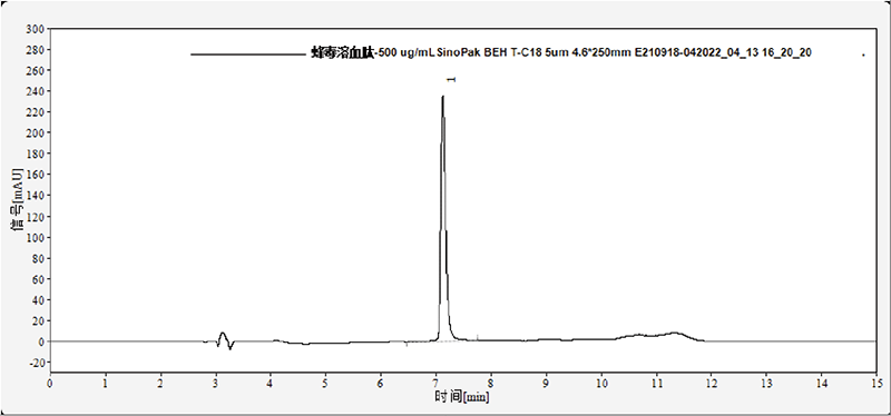 蜂毒溶血肽是一種由26個氨基酸組成的多肽,呈堿性,易溶于水,是一種人類所知的抗炎性強的物質之一。依利特參考GB/T 40486-2021,采用新推出SinoPak BEH T-C18 5 μm色譜柱對蜂毒干粉中蜂毒溶血肽進行分析檢測,所得數據可供客戶參考使用。